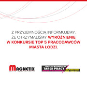 Jest nam niezmiernie miło poinformować, że dołączyliśmy do wspaniałego grona TOP 5 Pracodawców Miasta Łodzi. To szczególne wyróżnienie otrzymaliśmy podczas II Łódzkich Regionalnych Targów Pracy i rozwoju osobistego w Hali Expo. Prezydent Hanna Zdanowska nagrodziła wkład firm, w tym MAGNETIX Gorszwa Spółka Jawna, w rozwój rynku pracy i zmniejszanie bezrobocia.