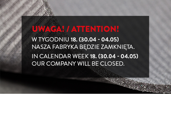 Kończymy pracę we wtorek, 30 kwietnia 2019. Wracamy do pracy w poniedziałek 06.05.2019. Proszę wziąć to pod uwagę podczas składania zamówień oraz planowania odbiorów z naszych magazynów. Żadne dostawy i odbiory nie będą możliwe w ww. terminach.